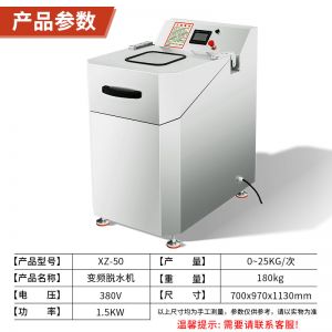 >XZ-50型脫水機,蔬菜脫水食品甩幹,變頻控製、方便快捷。速度調頻,脫水速(sù)度可根據不同產品需求調(diào)節不(bú)同速度。鈑金機身,機架鈑金是 2MM 厚(hòu),使整機運行時更(gèng)穩定,噪音更小。