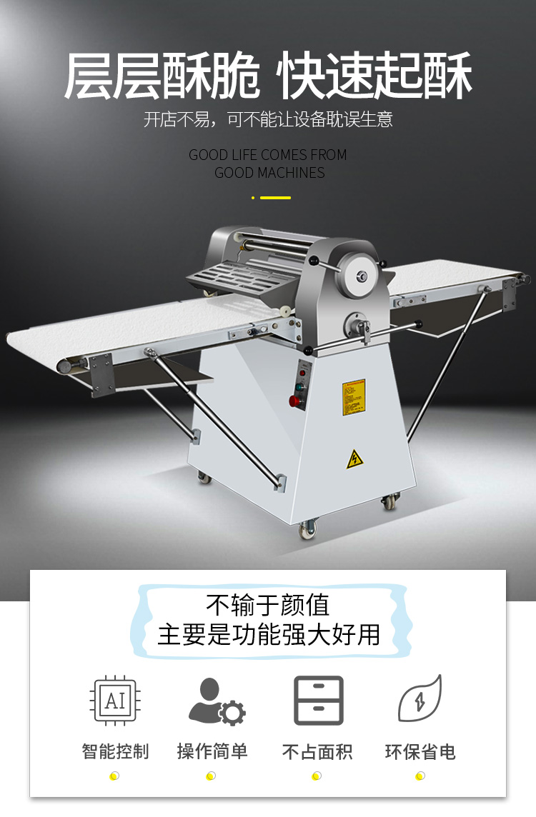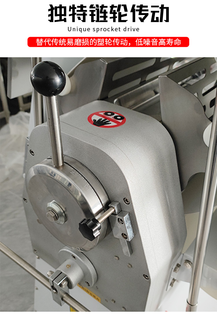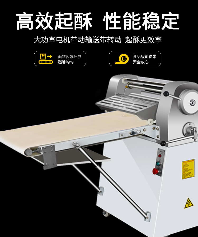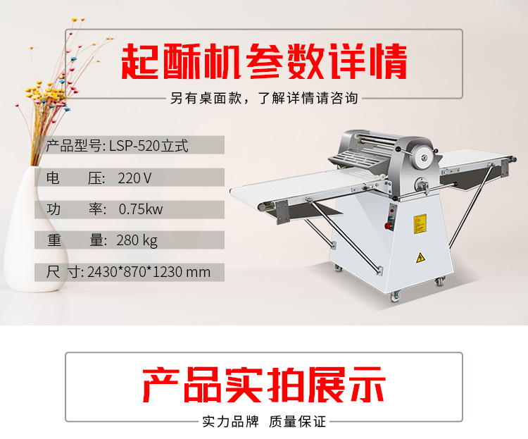 >LSP-520酥皮(pí)機,采用(yòng)獨特的鏈輪傳動替代了傳統易磨損的塑輪傳(chuán)動,低噪音,高壽命滾輪經過特殊工藝處理,不粘麵,不易刮傷適用於手撕麵包、羊角麵(miàn)包、蛋撻、老婆(pó)餅、千層餅,等酥皮類食品,也可用(yòng)於輾壓麵團。