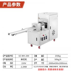 名稱XZ-MH-200麻花機 電源(yuán)220/380V 功率2.2KW 產(chǎn)量40-60斤(jīn)/小時 尺寸1970X500X1000mm 重量90KG 規格可調 其他