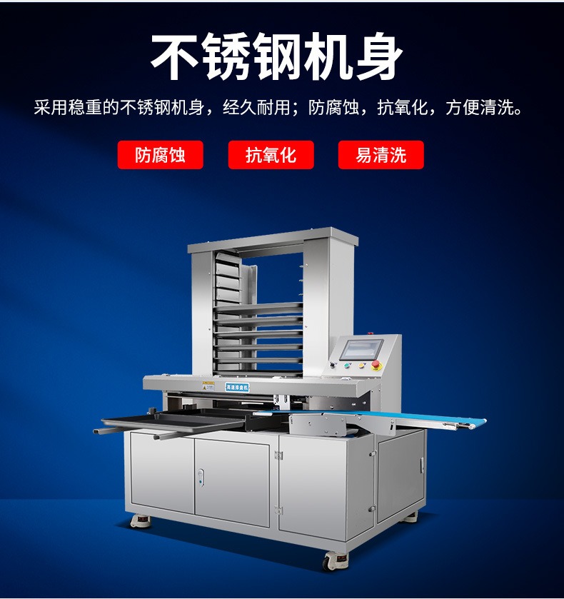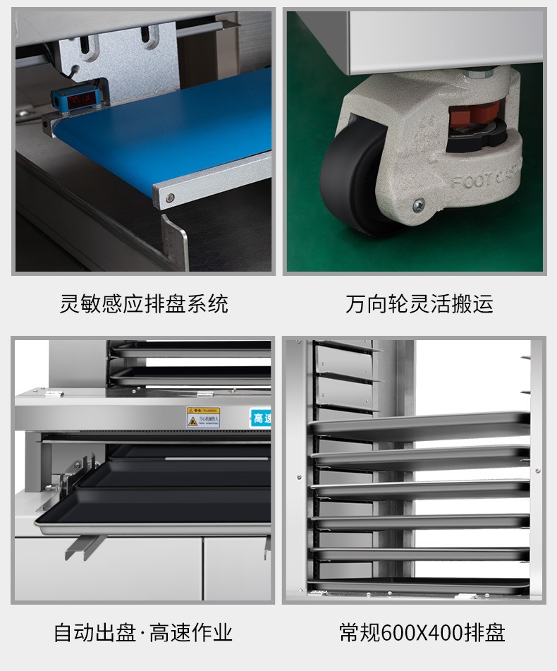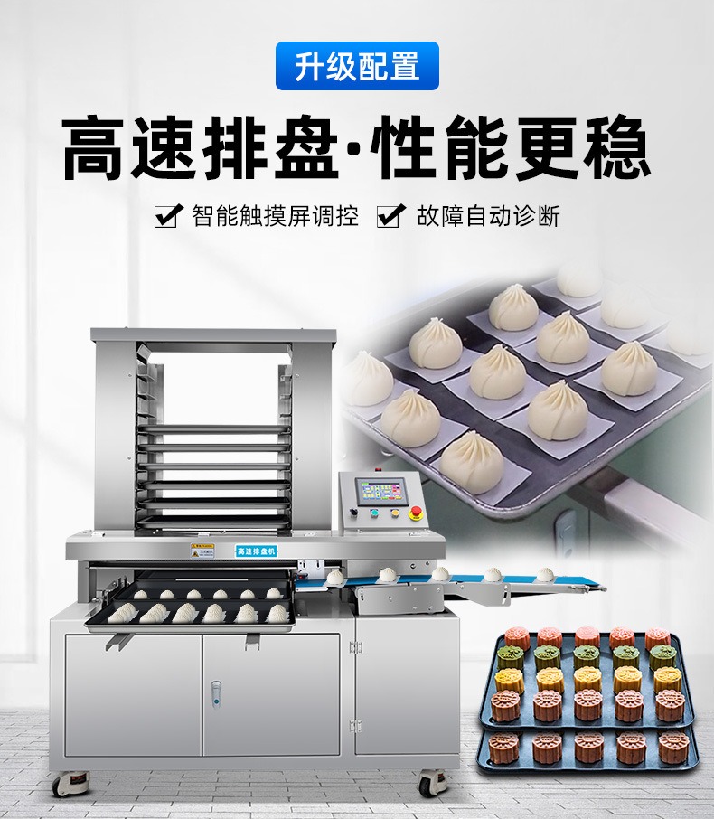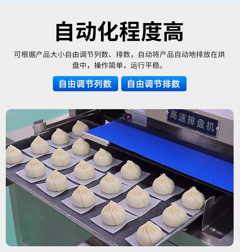 多功能商用高速排盤機,自動化程度高,可根據(jù)產(chǎn)品大(dà)小自(zì)由調節列數、排數(shù),自動將產品自動地(dì)排(pái)放在烘盤中,操作簡單,運行平穩。智能觸(chù)屏麵板(bǎn)。控製係統由三菱PLC和(hé)進口觸摸屏組成,操作簡單方便。具有故障自動診斷,一(yī)目了(le)然。