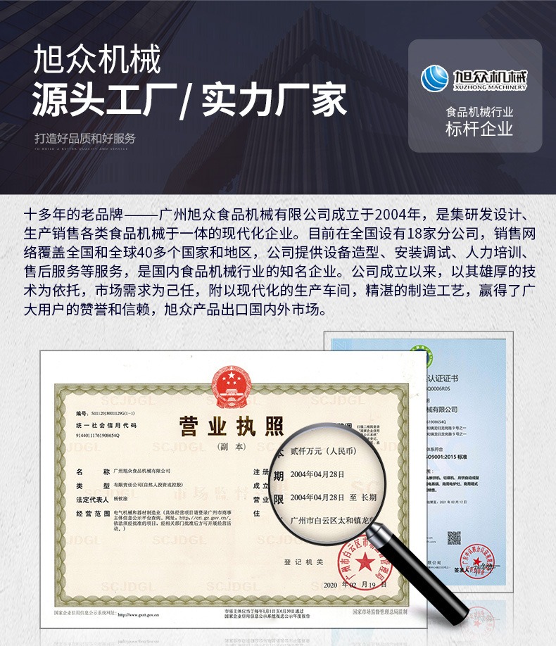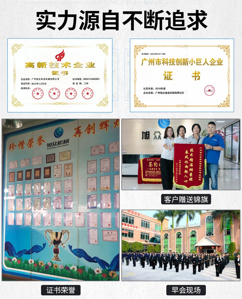 廣州旭眾食品機械有限公司是一家集(jí)科研開發,生產設計,營銷服務為一體的現代化生產企業。現代化生產車間,精湛製造技術,所產機械曆經市場重重考驗,不斷贏得海內(nèi)外客(kè)戶的讚譽。